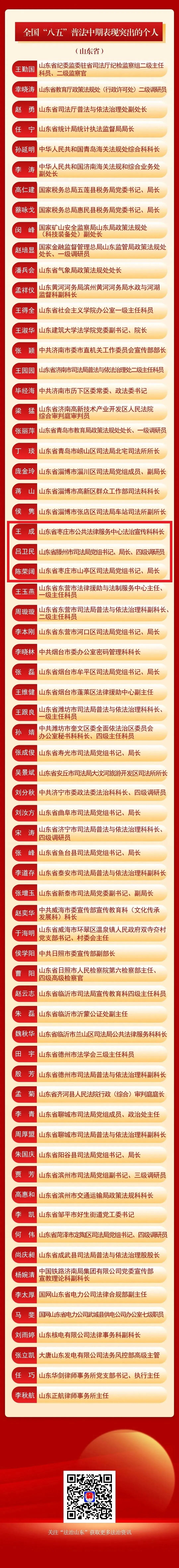 山东省83个单位、67名个人荣获全国“八五”普法通报表扬,枣庄市3个单位3名个人入选。