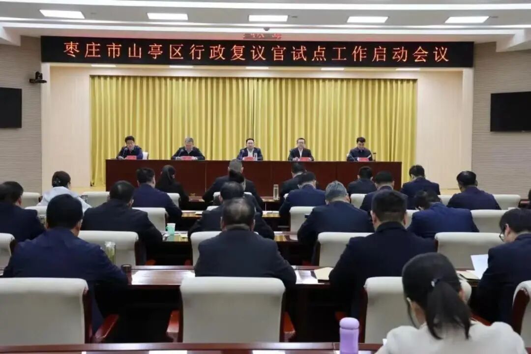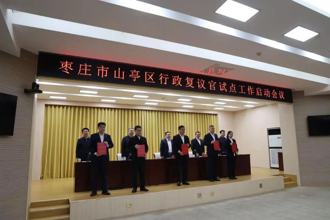 4月1日,山亭区召开行政复议官试点工作启动会议并举行行政复议官任命仪式。枣庄市司法局党组成员、副局长曹斌,山亭区委副书记、区长刘洪鹏等出席会议。