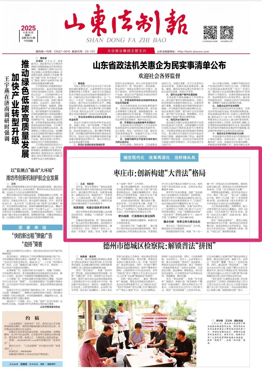 6月16日,《山东法制报》以《枣庄市:创新构建“大普法”格局》以题,头版刊登了枣庄市将落实“谁执法谁普法”普法责任制作为深化依法治市的关键抓手,探索形成了“党委领导、人大政协监督、部门协同、社会参与”的普法依法治理新模式。详情如下: