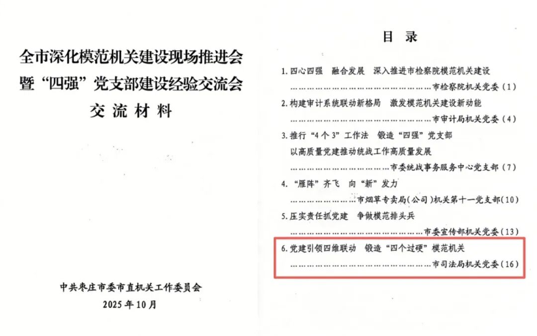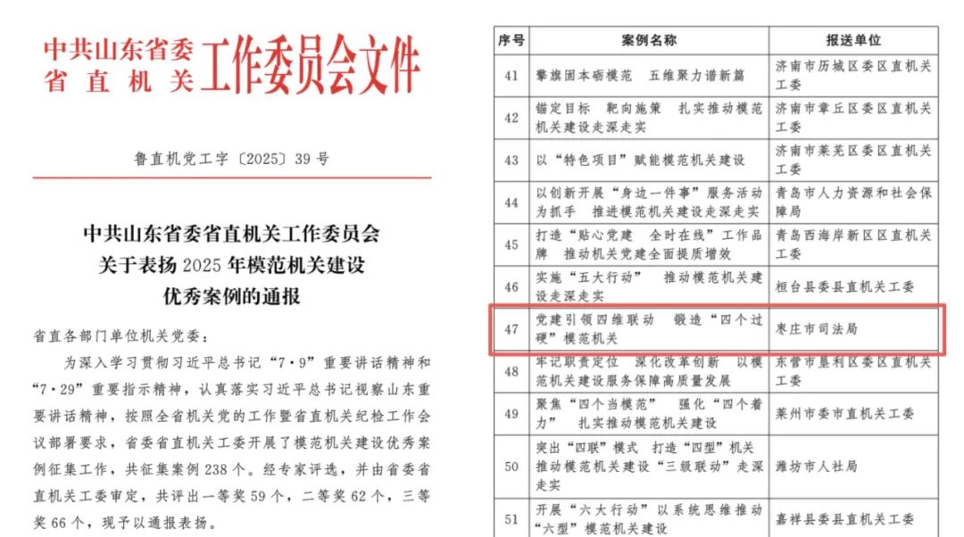 枣庄市司法局模范机关建设案例被省直机关工委评为2025年模范机关建设优秀案例三等奖。