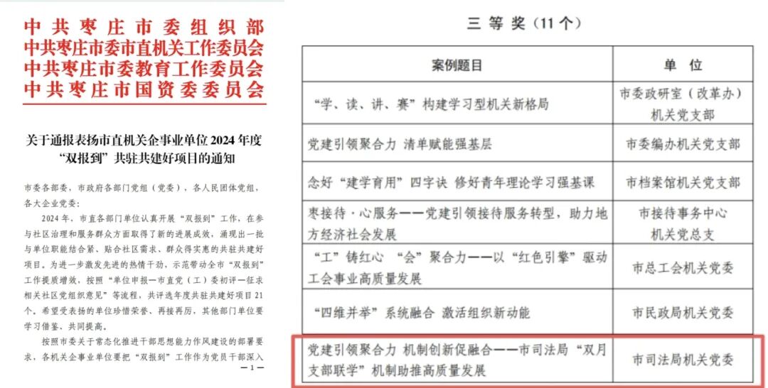 枣庄市司法局“双月支部联学”机制荣获市直机关党建优秀创新案例三等奖。