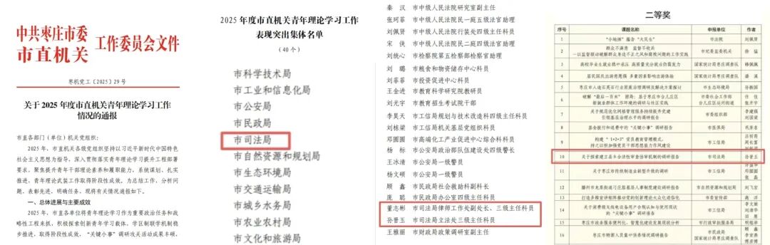 枣庄市司法局荣获2025年度市直机关青年理论学习工作表现突出集体,2名同志荣获表现突出个人,1篇调研报告荣获市直机关青年理论学习“关键小事”调研攻关活动二等奖。