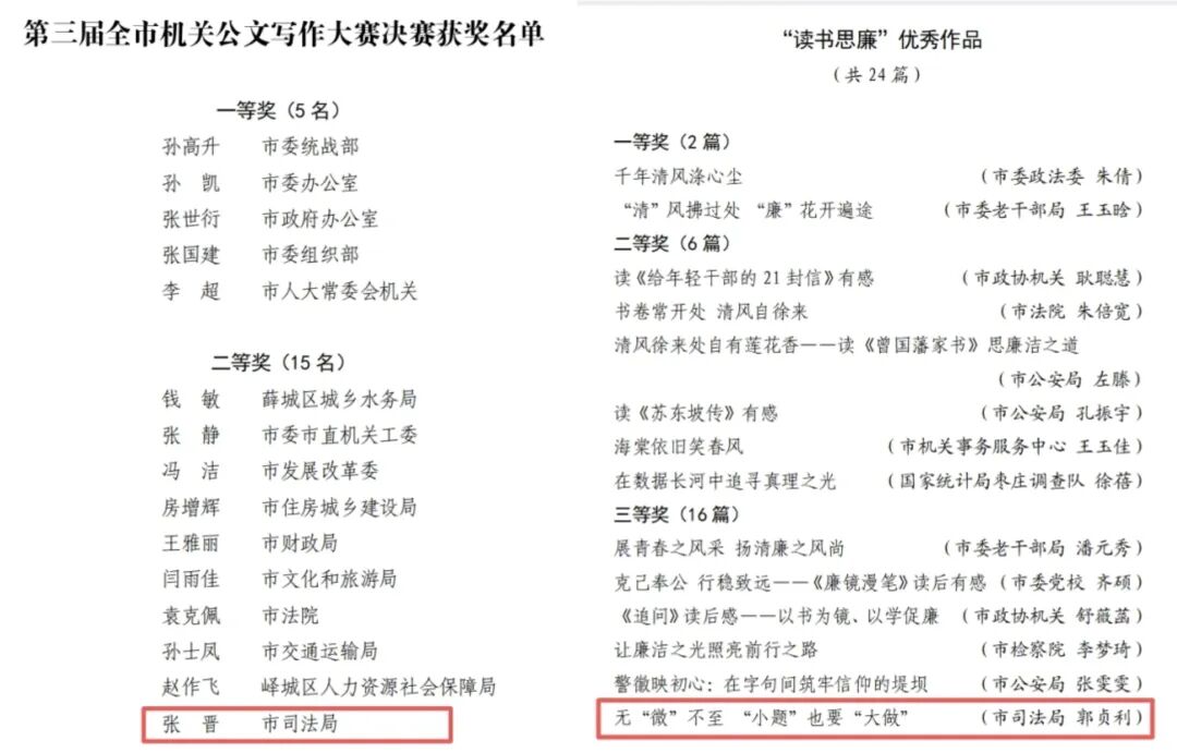 枣庄市司法局1名同志在第三届全市机关公文写作大赛决赛中荣获二等奖,1篇作品在“光影映廉·读书思廉”活动中获三等奖。