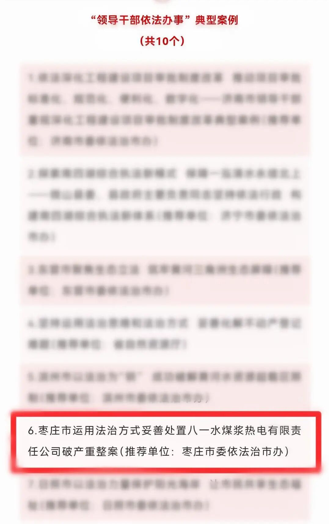 近日,省委依法治省办公布全省“领导干部依法办事”典型案例优秀案例名单,枣庄市推荐的《枣庄市运用法治方式妥善处置八一水煤浆热电有限责任公司破产重整案》成功获评全省“领导干部依法办事”典型案例。